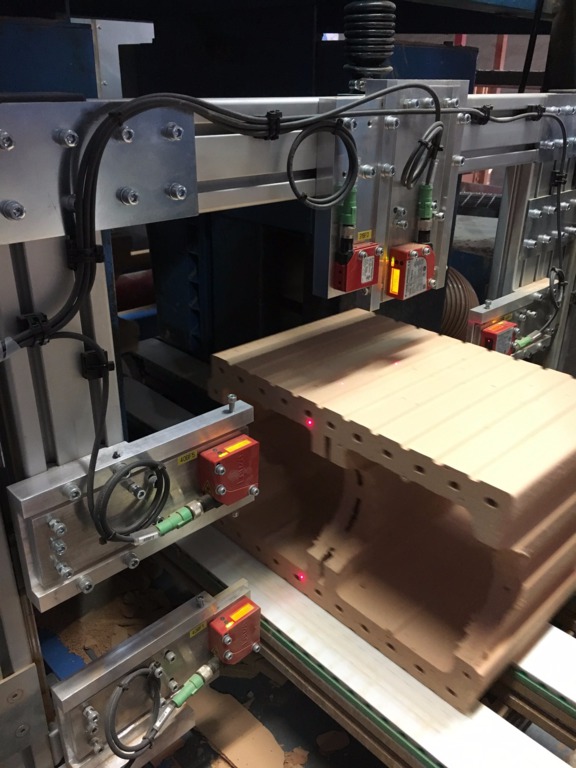 Messstation zum Messen der Ziegel in Länge, Breite und Höhe. Mit einer Waage an der Stapelung wird das "Nettogewicht" erfasst.